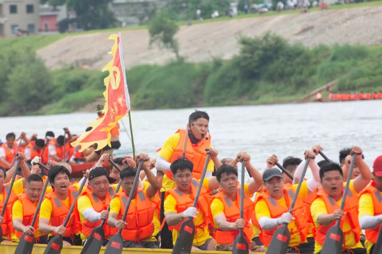到了下午,龙船都往上码头水域云集,鼓声密集,这是比赛的前兆,气氛霎时紧张。此时,有两条龙船分别从左右两边绕到河中央,突然鼓歇锣停,舵手在摆开阵式。眼尖的观众看出了端倪-----要比赛了!转瞬间,双方鼓手突然紧鼓,苗手埋头弓腰,奋力挥楫,浪花飞溅,鼓声咚咚,锣声咣咣,哨声吡吡,节奏激越,两船如同出水的蛟龙,劈波斩浪,前面的龙船纷纷让道,自觉地腾出赛道,并为双方助威。顿时,两岸人群骚动,龙船所过之处,观众“加油、加油”大声呐喊,龙船过去,全都踮脚眺望。那比赛双方的龙船像离弦之箭,直逼翥山脚下。几千米的赛程,不服输的劲头让数万观众为之折服。在人们的期盼中,两船终于从翥山方向逆水而来,行在前面的一只,苗手昂头挺胸,