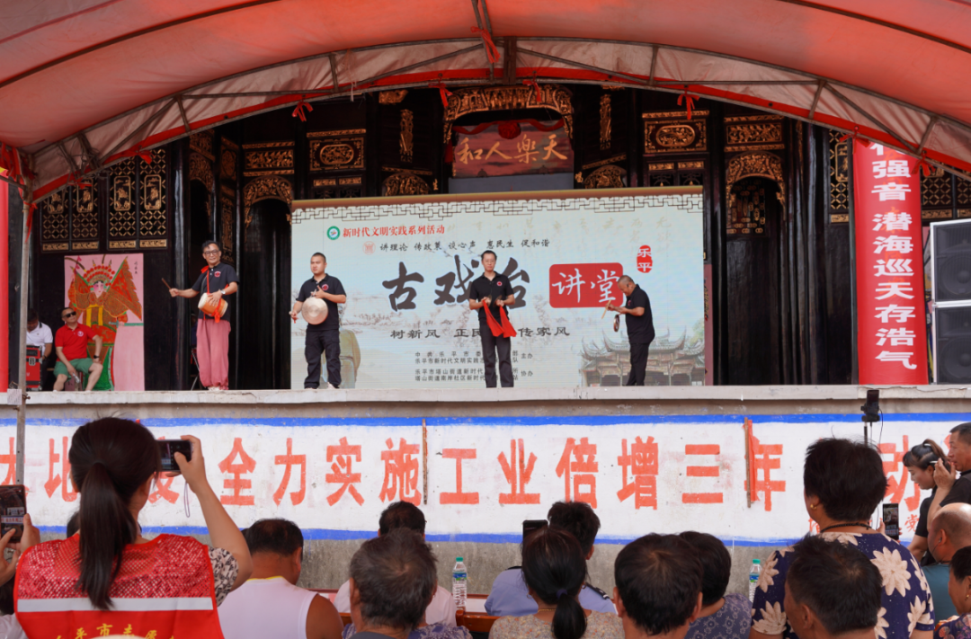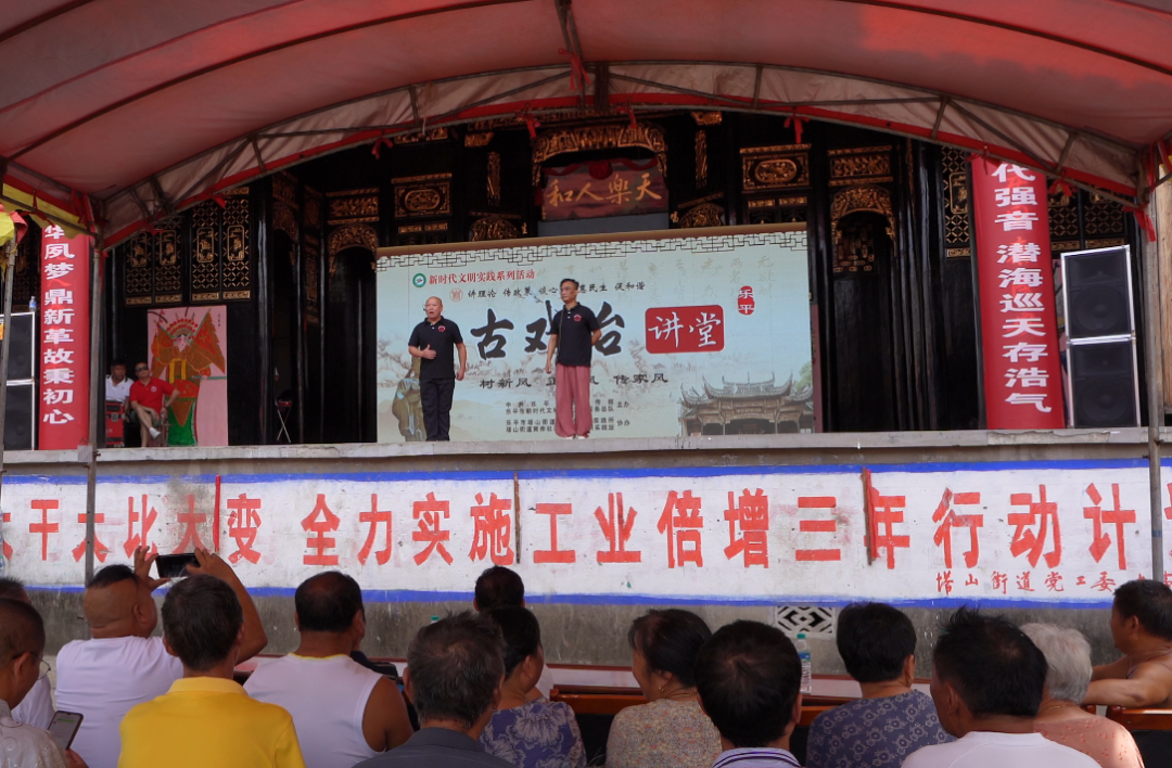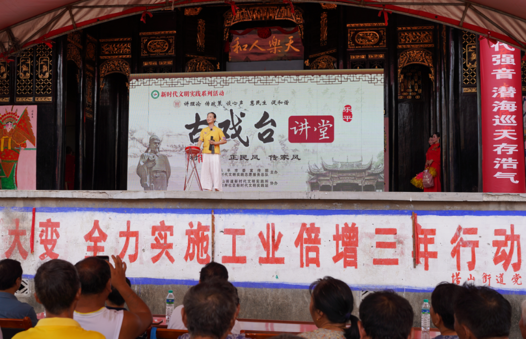 7月11日上午,由市委宣传部、市新时代文明实践服务总队主办,塔山街道新时代文明实践所、南岸社区新时代文明实践站承办的学习宣传贯彻党的二十大精神“古戏台讲堂”宣讲暨移风易俗专题文艺巡演在塔山街道南岸社区古戏台火热开展,市委宣传部副部长余昭勇莅临指导,街道党员干部及村民300多人现场观看。